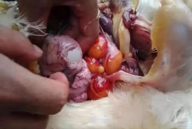 十二指腸黏膜粗糙,內附黃油狀物,十二指腸末端腸黏膜上有條狀出血性腫脹。十二指腸及小腸黏膜上有火柴頭及筷子頭大小的出血性壞死性病灶。個別雞小腸黏膜脫落,腸腔內充滿氣體,內含未消化的飼料。輸卵管黏膜呈乳黃色,皺褶變厚,內分泌物增多,輸卵管下端呈暗紅色,黏膜粗糙。泄殖腔黏膜有點狀或片狀出血,泄殖腔內有黃白色、或黃綠色稀糞。盲腸扁桃體腫大,出血性壞死,直腸黏膜有細砂樣出血點。其他臟器基本正常,僅有個別病死雞肝臟、脾臟腫大,被膜下有灰白色或灰黃色針鼻大的壞死點。